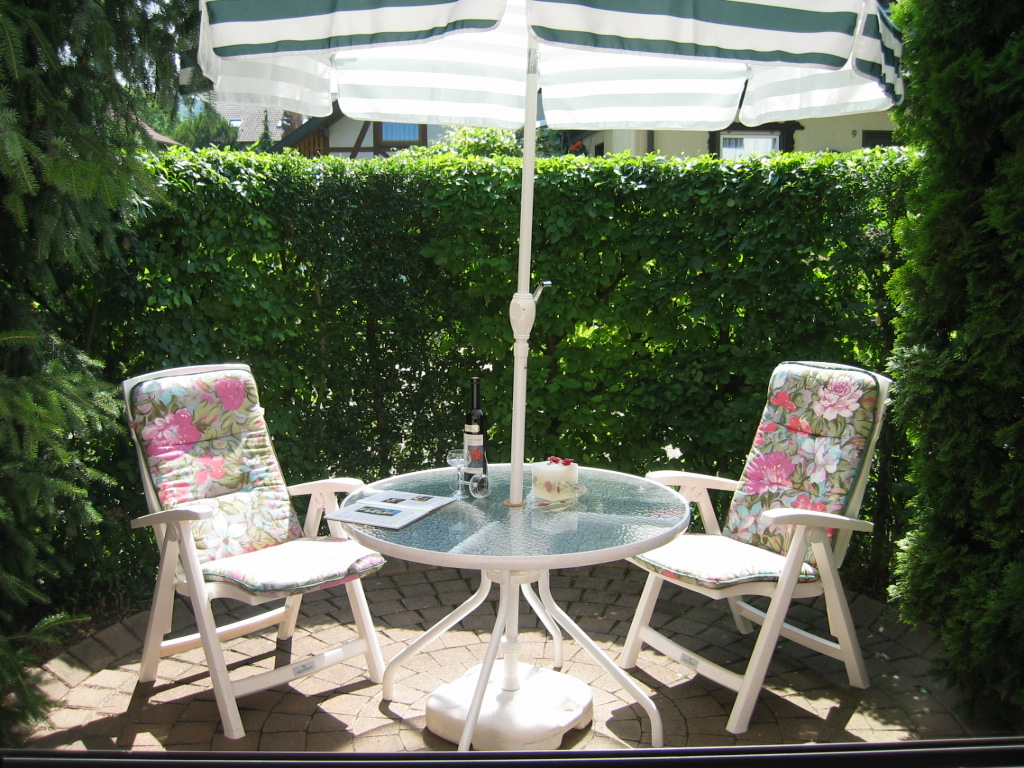 gemütlicher Freisitz mit Gartenmöbeln und Sonnenschirm