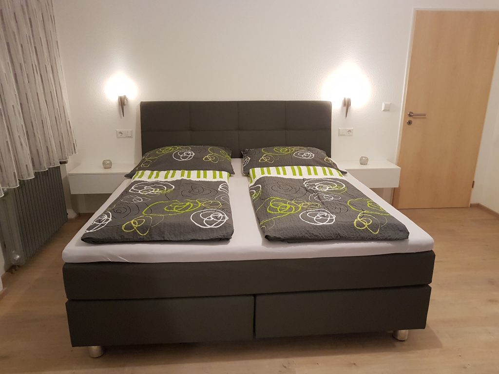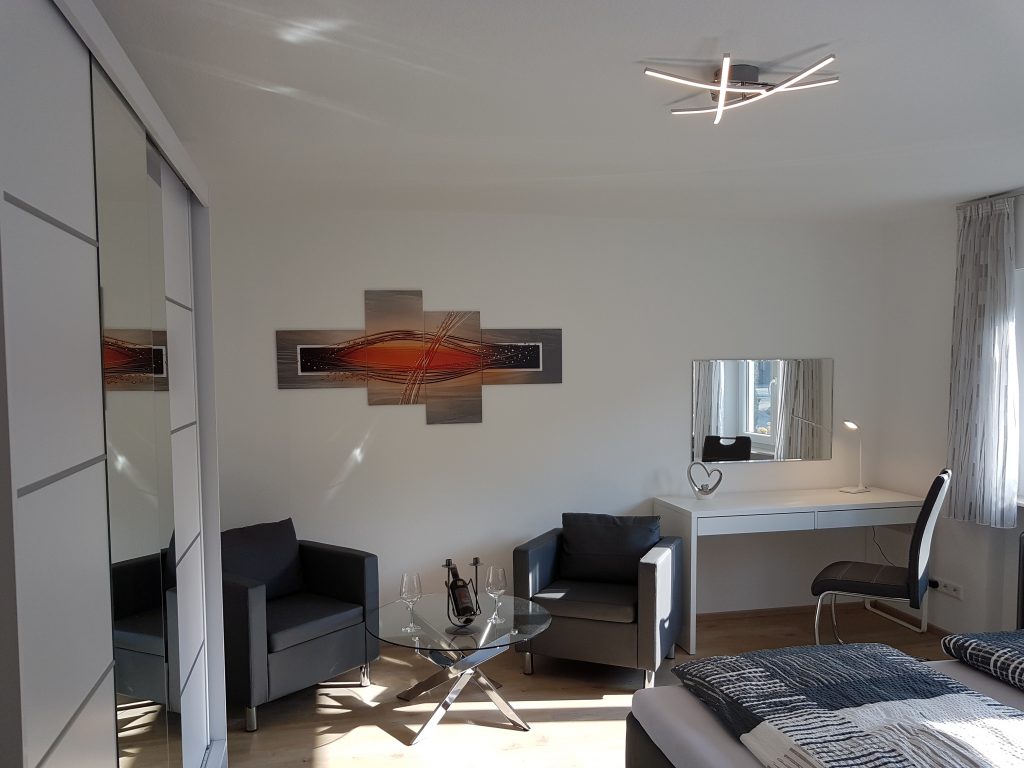 Geräumiges Schlafzimmer mit Boxspringbett, Lounge und Schminktisch mit Spiegel.
